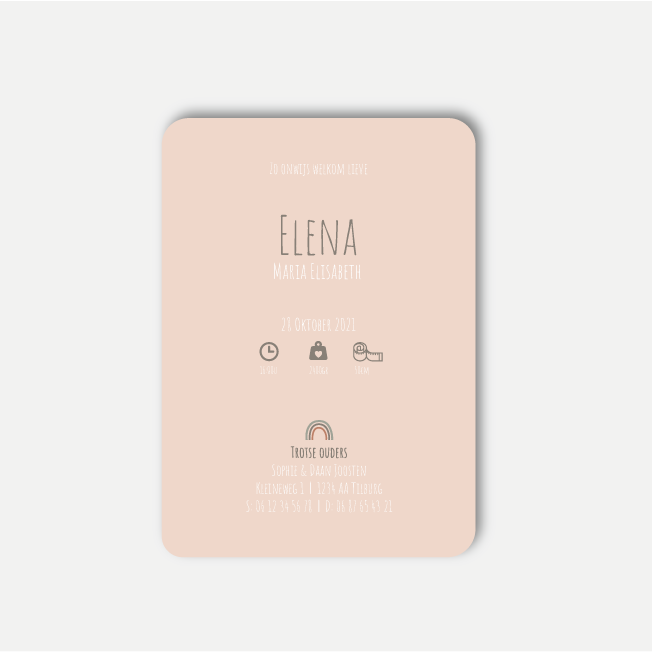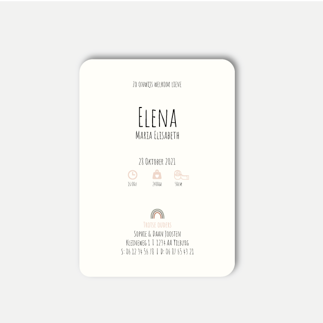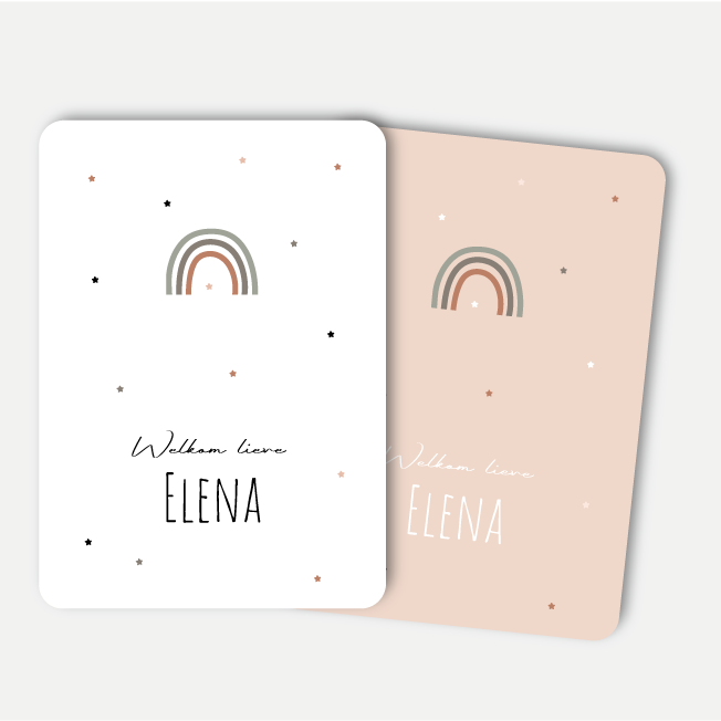 Een wit of licht (oud) roze geboortekaartje voor jouw pasgeboren dochtertje. Er staat een kleine regenboog afgebeeld en het kaartje is inclusief een afwerking met ronde hoeken.