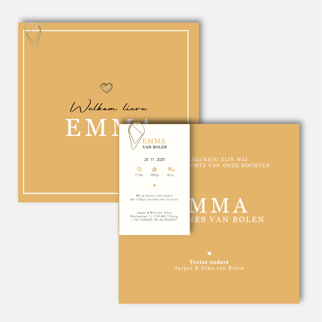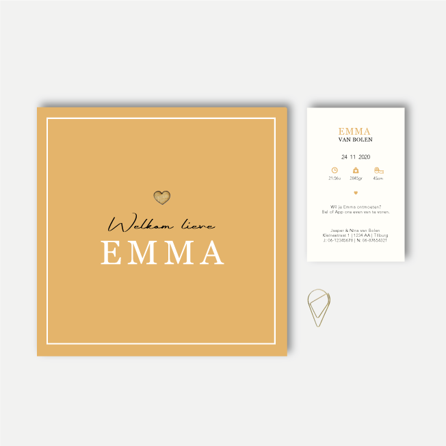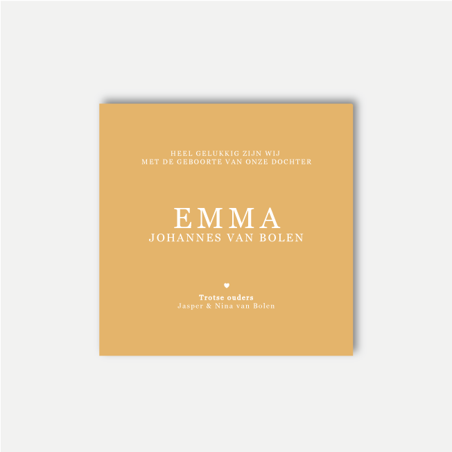 Een Butterscotch geel geboortekaartje voor jouw pasgeboren dochtertje met witte rand en een houten hartje op de voorkant.