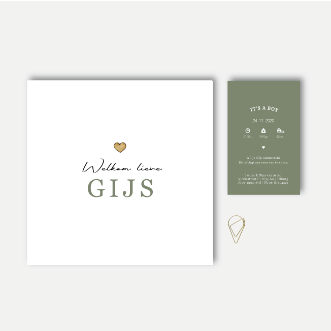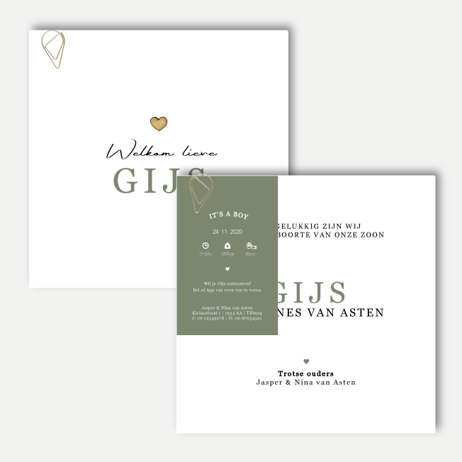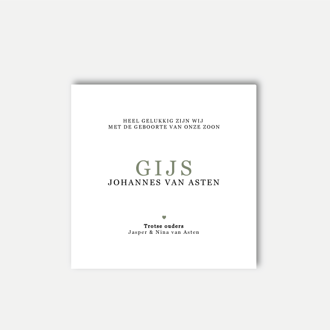 Een wit geboortekaartje voor jouw pasgeboren zoontje met een houten hartje op de voorkant.