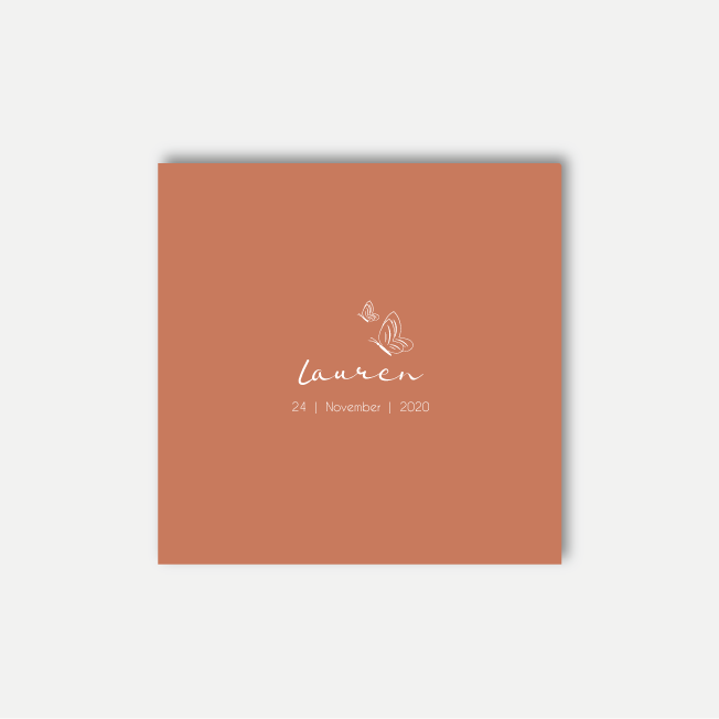 rose gekleurd geboortekaartje voor jouw pasgeboren dochtertje met kleine vlindertjes afgebeeld.