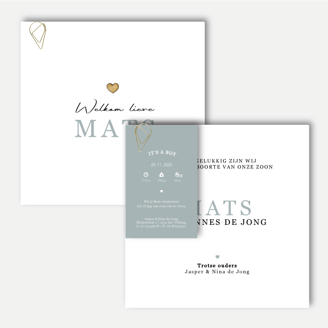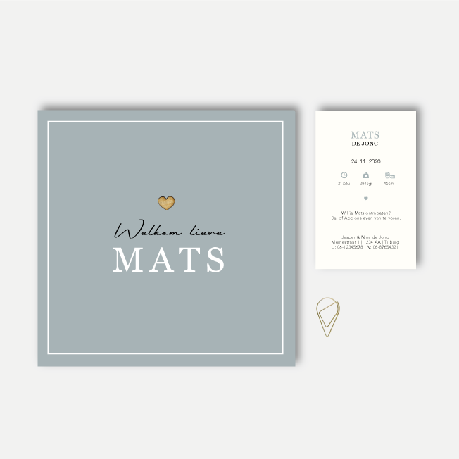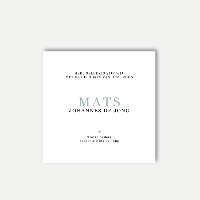 Een Smoky blauw geboortekaartje voor jouw pasgeboren zoontje met een witte rand en houten hartje op de voorkant.